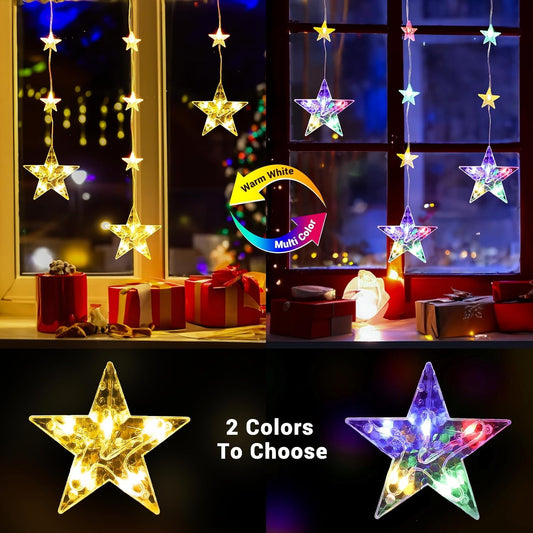 32 Stars Curtain Lights Battery Operated, Warm White Multicolor Christmas Star Window Lights with Timer & Memory Function & 8 Modes, IP65 Color Changing Curtain Lights for Window Decoration