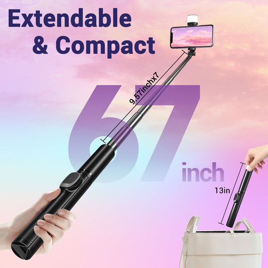 67" Selfie Stick Tripod, Tripod for iPhone with Remote and RGB Light, Extendable Phone Tripod for iPhone/Android, Portable Travel Tripod for Video Recording and Live Streaming